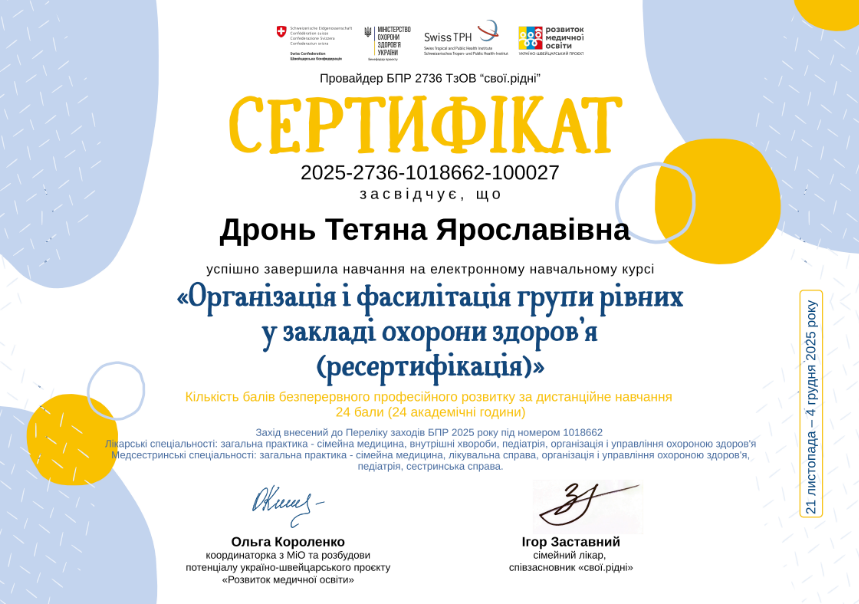 Фасилітаторка групи рівних – медична директорка КНП “Кіцманський центр ПМД”, сімейна лікарка Дронь Тетяна, яка пройшла тренінг “Фасилітація груп рівних для медичних працівників» та пройшла курс по ресертифікації хгідно чинних вимог МОЗ України.